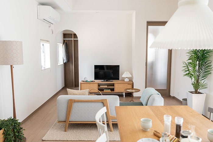 オーク材の家具をベースとして、まとまりのある印象を感じられるリビングスペース。Luu Sofaが主役なので、照明やインテリアアクセサリーは空間に馴染む色にすることで、よりまとまりのある空間にすることができます。