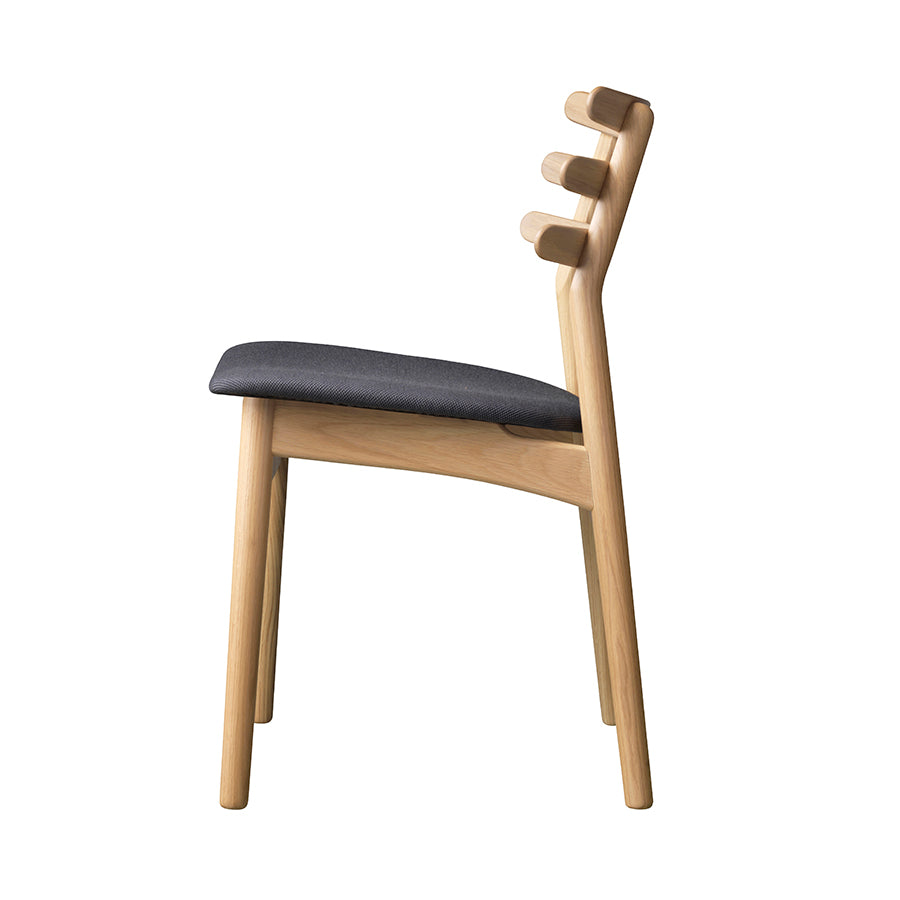 今回FDBモブラーの商品の中で唯一、座面が木部のものとファブリック、レザーとをお選び頂けるようになっており、ダイニングシーンの主軸となる位置づけでリリースされています。