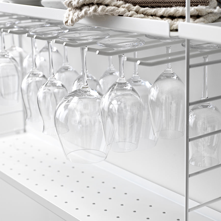 オプションのレールやフック、グラスハンガーなどを取り付けることで機能をアレンジできるフレキシブルな棚板