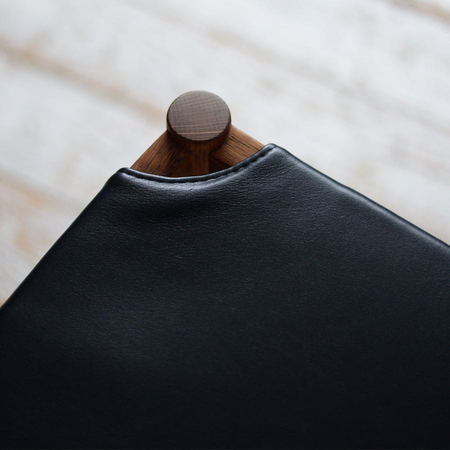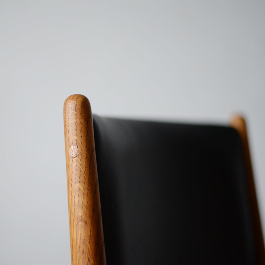オーク材のフレームに、革と木の美しさを引き立てる独自の構造が特徴です。
