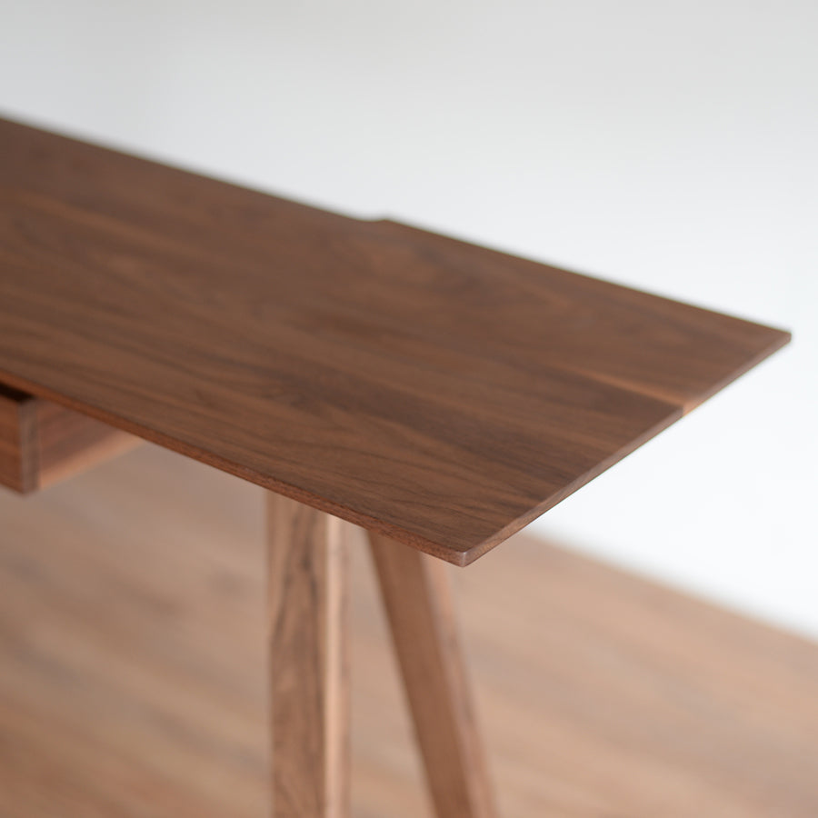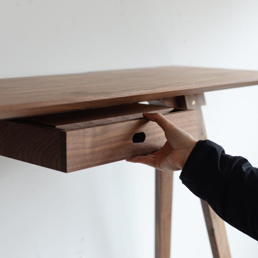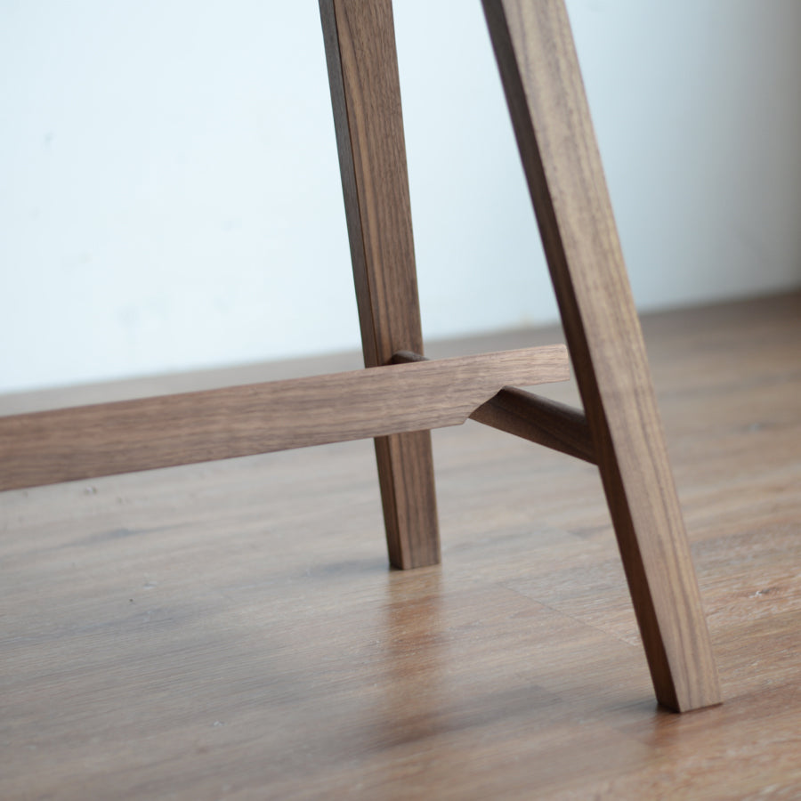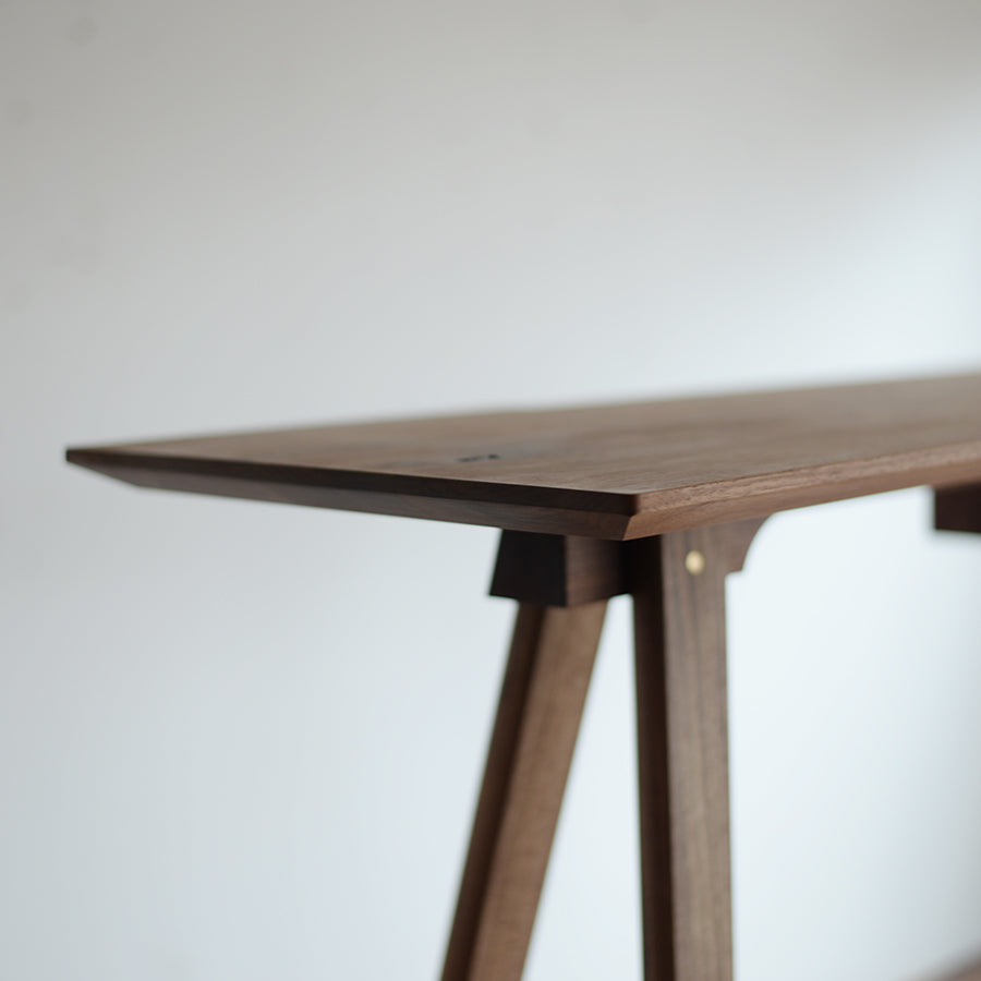 通常、高さがあり奥行きのない華奢なテーブルは揺れが大きくなり、使い勝手が悪いとされていますが脚の幅や厚み、角度を1mm、1度単位で細かく検証することで最も安定する構造を作り、シャープな印象を損なわないデザインへと落とし込みました。