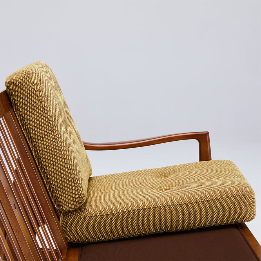 1960年頃、対米輸出用として生産されたものを後に日本向けに発売し 2011年に復刻されたモデル「フレームチェア」。 すっと手になじむ湾曲したフレーム、取り外し可能なファブリックなど Kチェアと似て非なるデザインや機能が人気の一脚です。