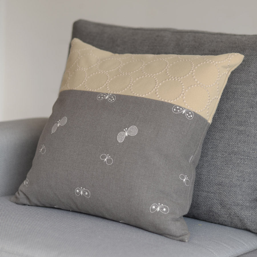 ミナペルホネン ドップ 「タンバリン×チョウチョ」クッションカバー エクリュ×グレーmina perhonen(ミナ ペルホネン)の人気ファブリックを2種類使用した、greenicheだけのオリジナルクッションカバー