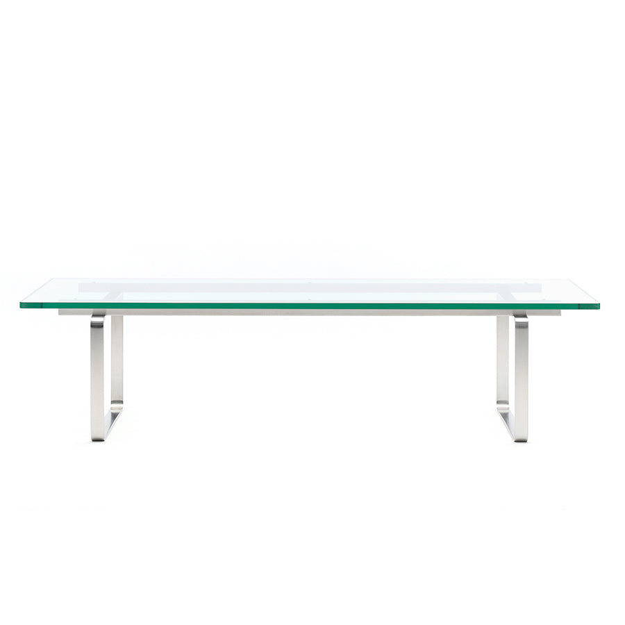 透明なガラス天板と、シャープな印象のステンレススチールフレーム。