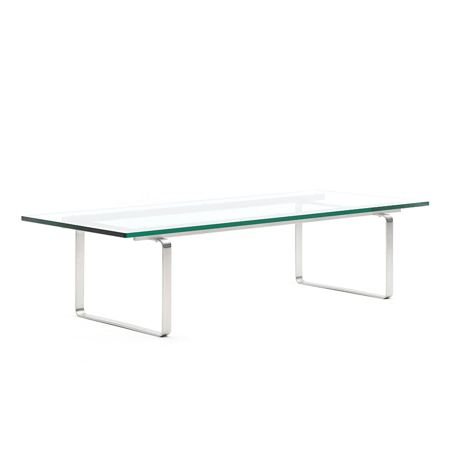 ガラス天板とステンレススチールフレームを組み合わせた構成は、木材を主とした作品が多いウェグナーの中でも異彩を放ち、