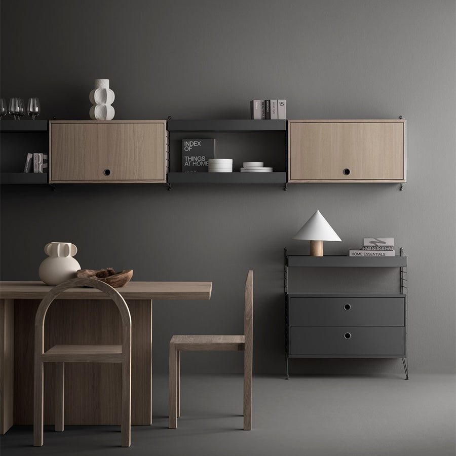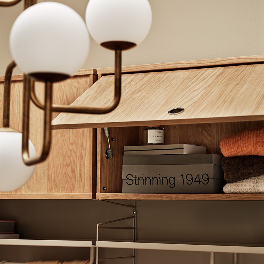収納パーツが豊富なString Systemに新たに加わったフリップドアキャビネット。