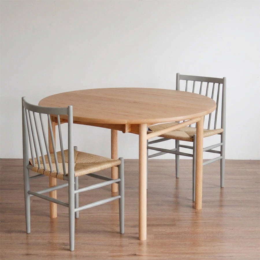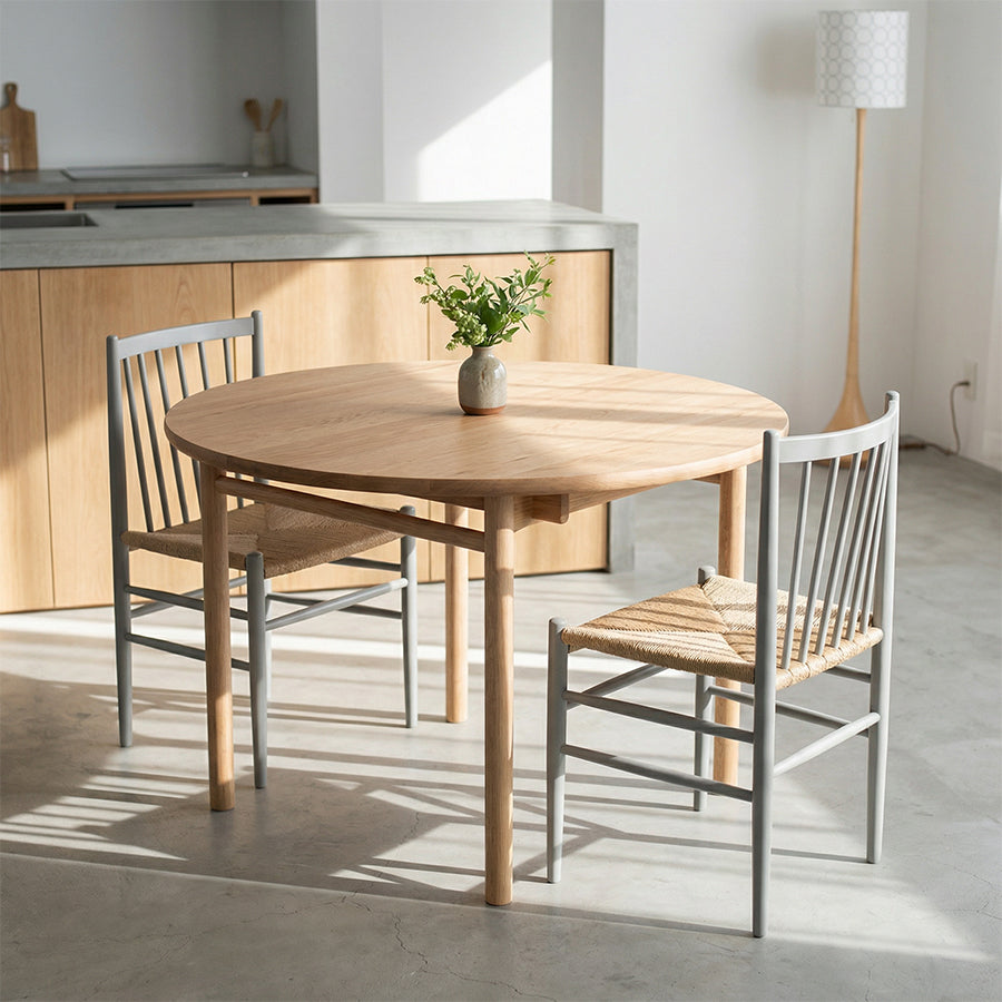 Aalborgの丸い無垢テーブルに、ゆったりと身体を支えるJ80チェアを2脚。