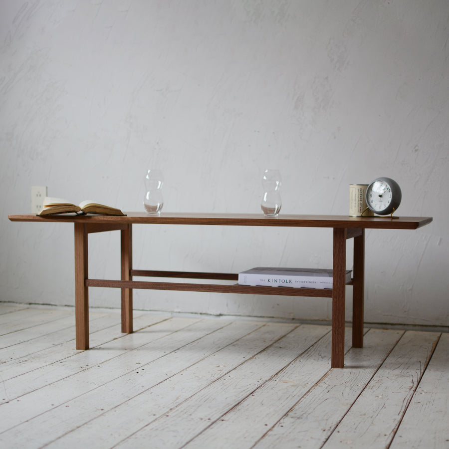 天板裏側の面取り加工、そして120cmのワイドを感じさせない華奢な脚部。デザインに工夫を施すことで、無垢だけど重くない印象に仕上げました。