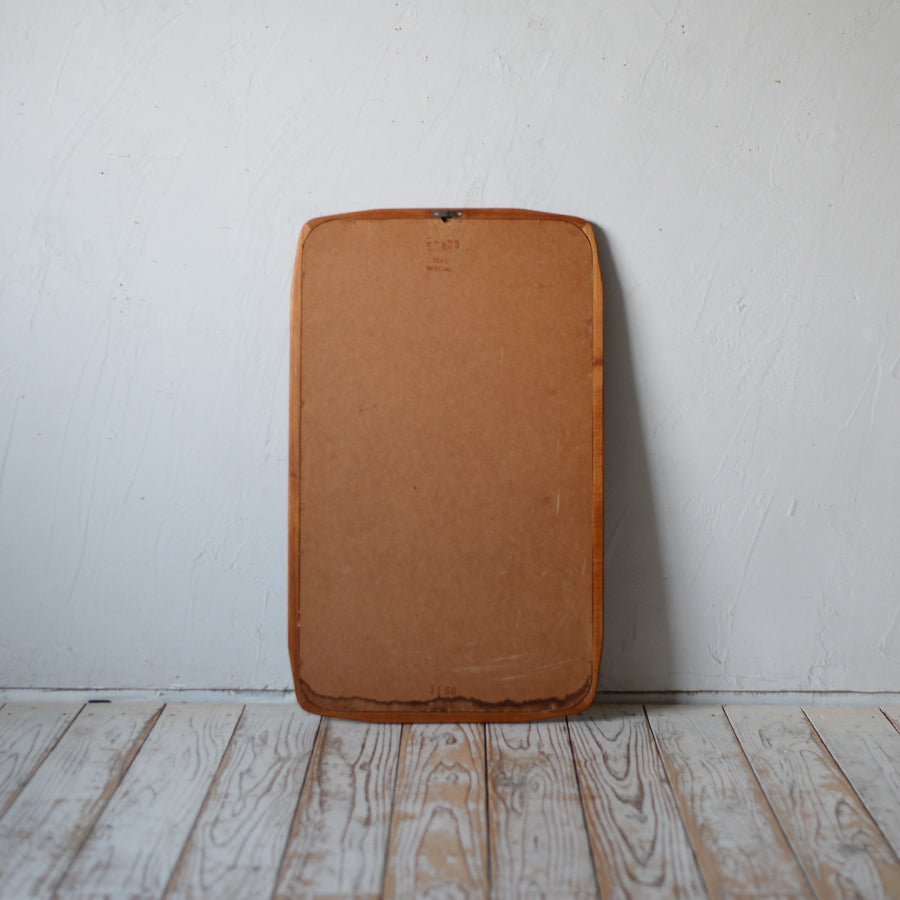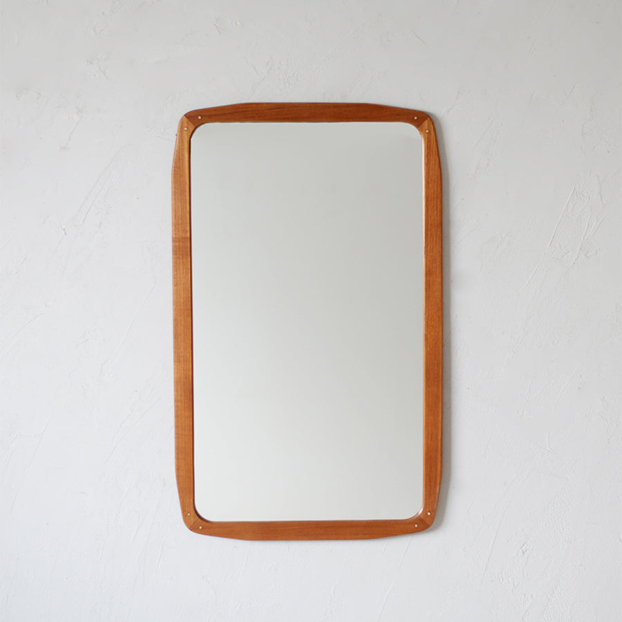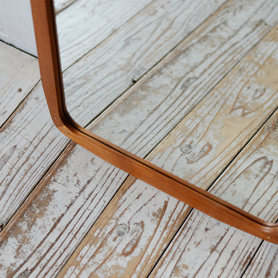 角に丸みを持たせた柔らかなシルエットが印象的な、チーク材の北欧ヴィンテージミラー。