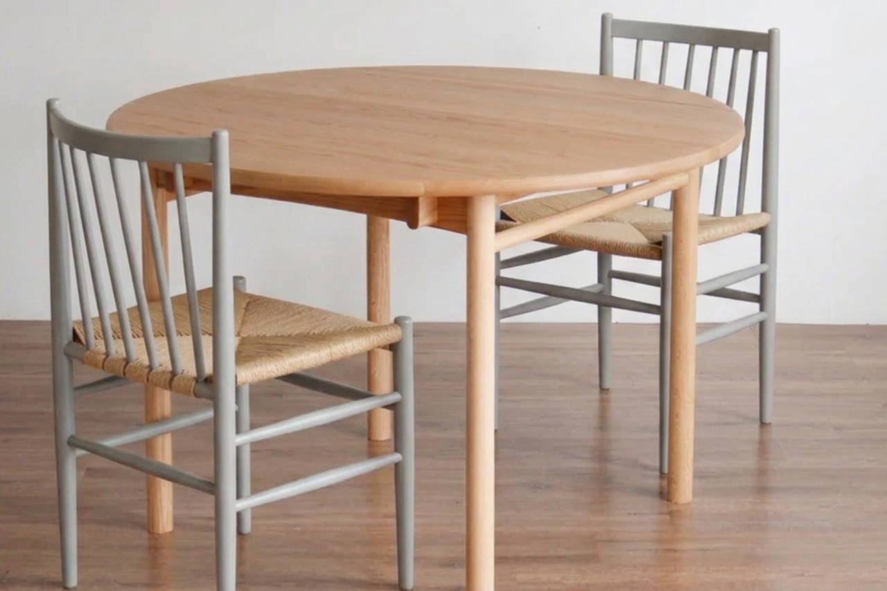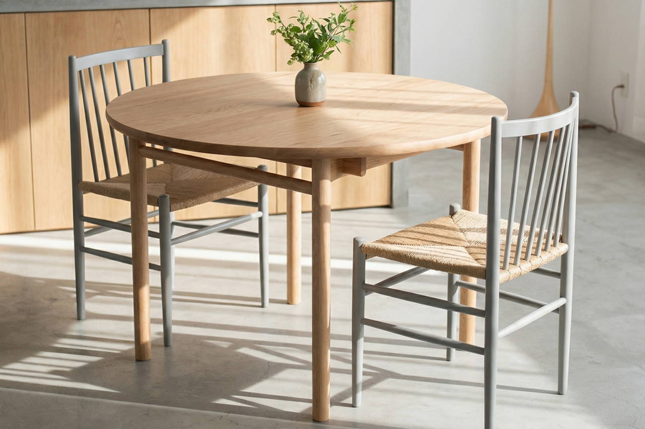 一人暮らしでも、ふたり暮らしでも。ダイニングは「食べる場所」だけでなく、仕事をしたり、コーヒーを飲んだり、会話をしたり...一日の真ん中にある居場所になります。Aarborgの丸い無垢テーブルに、ゆったり座れるJ80を2脚。小さな贅沢を、毎日の当たり前にしてくれるセットです。
