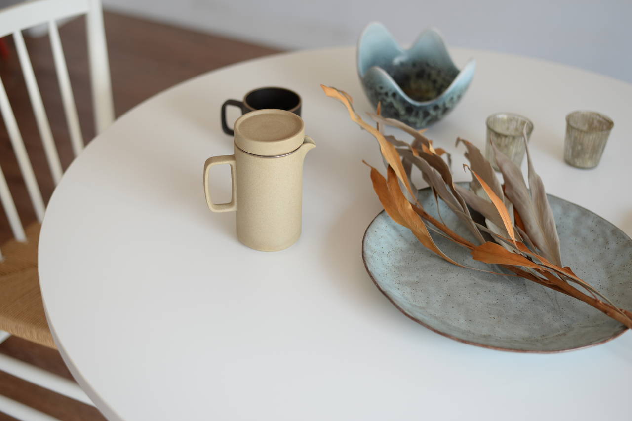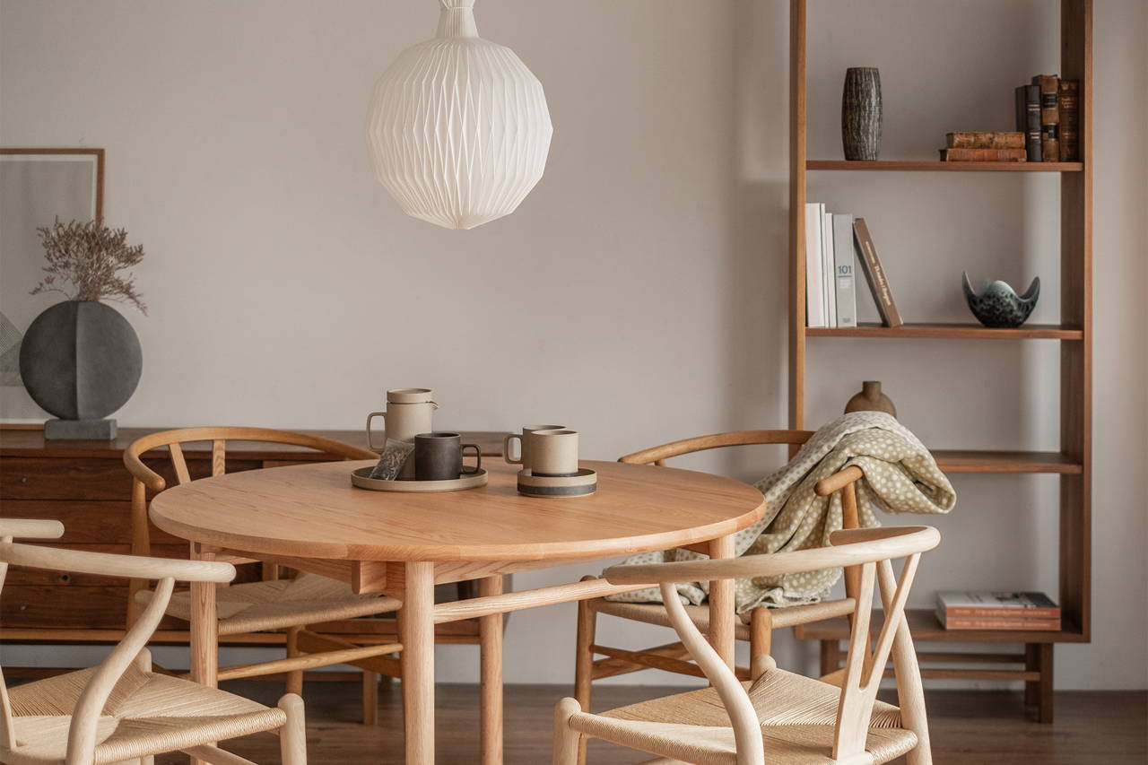 「Aalborg(オールボー)」「Aarhus(オーフス)」は、やわらかなフォルムの北欧チェアと響き合うようにデザインされたダイニングテーブルです。北欧ヴィンテージ家具や北欧家具ブランドのチェアとの相性を追求し、プロポーション・脚の角度・木口の仕上げまで何度も試作を重ねて完成したかたち。緩やかなアールを描く天板の木口や、4本脚の繊細なラインが印象的で、空間に軽やかさと温もりをもたらします。ラウンド型の「Aalborg」、スクエア型の「Aarhus」で、暮らしとお好みに合わせてお選びいただけます。