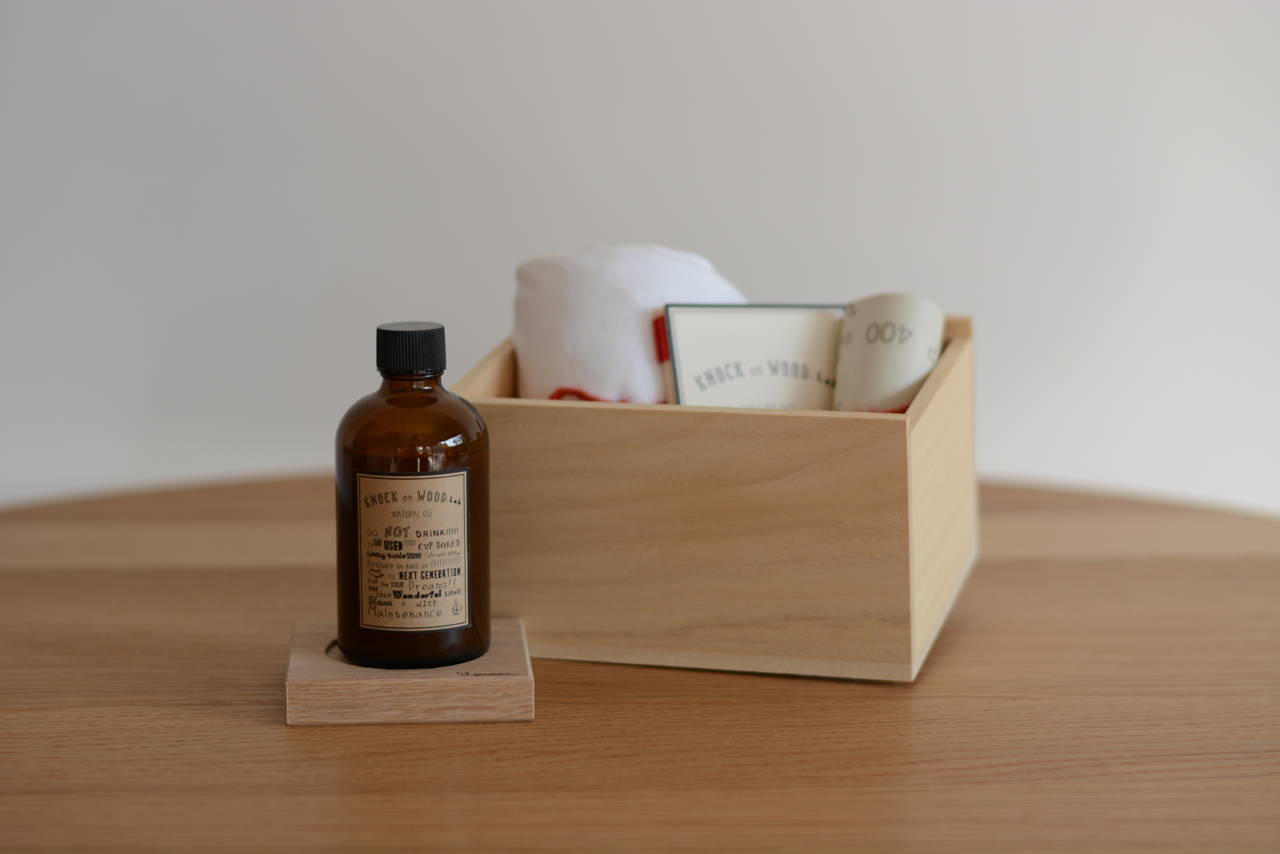 greeniche無垢家具の魅力は、長く使いながら育てていけること。使い込むほどに深まる色合い、手を入れながら育てていく時間。それが、「家具との大切な関係」のひとつだと私たちは考えています。そこで今回、テーブルをご購入いただいた方へもれなく、 メンテナンスキットをプレゼントいたします。