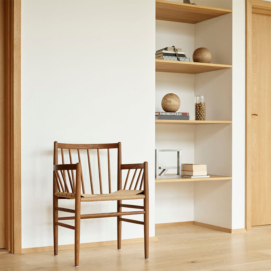 J80がこれまでのチェアと大きく違う点は木部が非常に細く、モーエンセンが採用して以来、ヴォルタとヨハンソンの採用することのなかったペーパーコードを座面に用いたことです。 また蒸気でひねりを加えたオークの背はJ80の為に開発されました。 それらを採用することで従来より大きさの割に軽く、柔らかい座り心地と快適な背を実現しました。