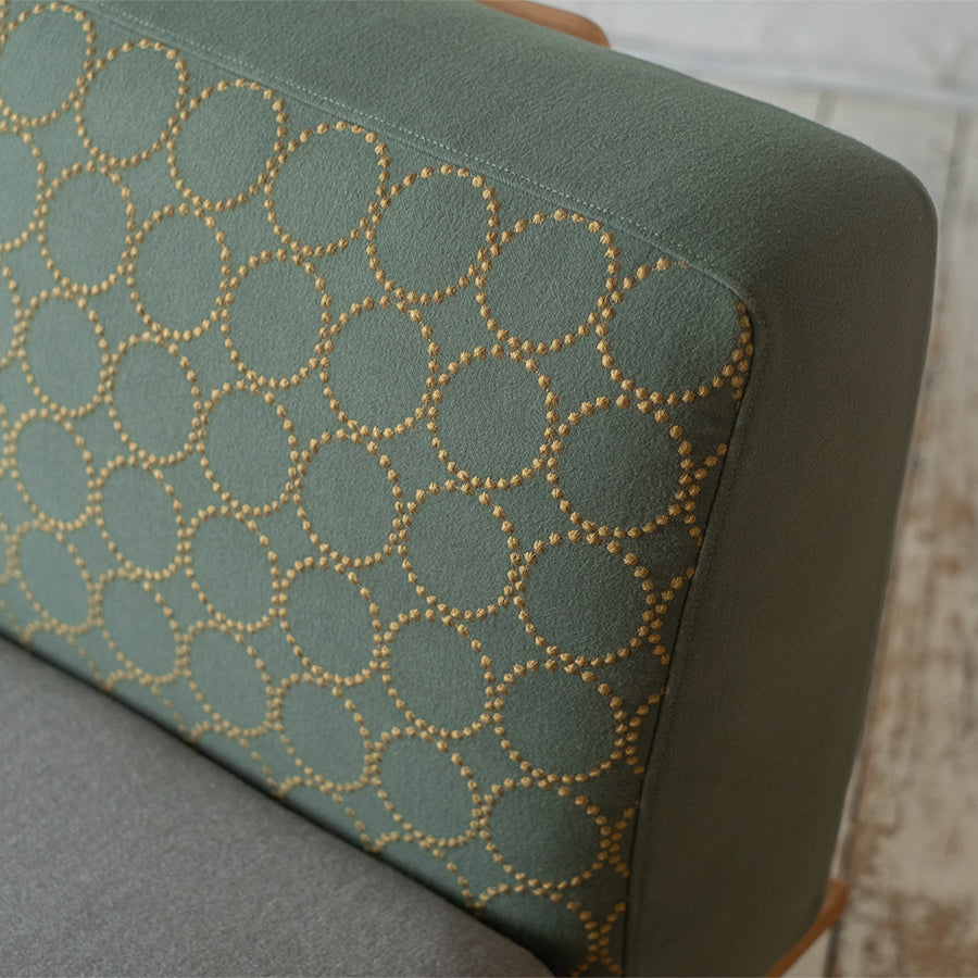 落ち着いたカラーが多いため、ビンテージの深みある褐色とも相性が良い生地です。目が細かく、シャープなラインを出したいチェアにお勧めです。また、生地には若干のふくらみがあり、包み込むような優しい質感になっています。