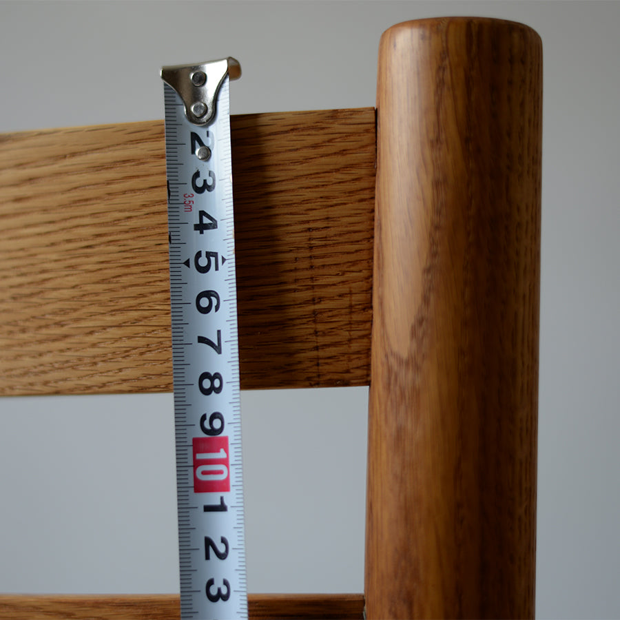 骨太なオーク材で構成されたフレームは、手に触れることでその意図された重みがじんわりと伝わってきます。
